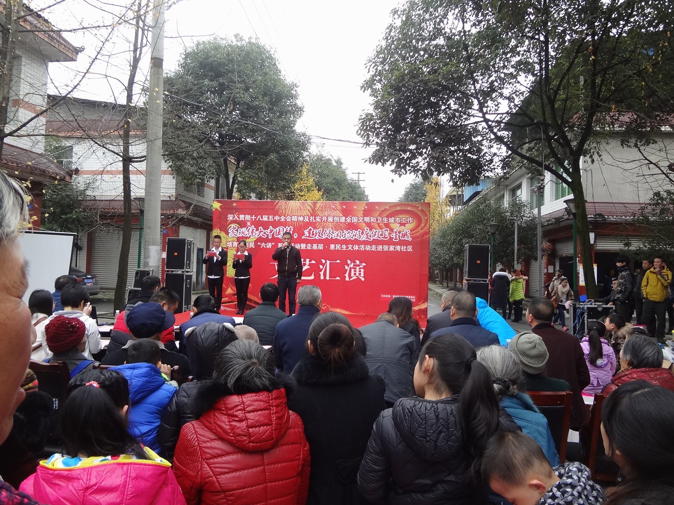 | 12月13日,本会都江堰华爱青少年服务中心与都江堰市奎光塔街道张家湾社区合作举办了以“实现伟大中国梦,建设休闲旅游度假卫星城”为主题的群众性文艺汇演活动。社区文艺小队精心编排的颇具本土特色的舞蹈表演和宣传创文明卫生城市、尊老爱幼的小品,引得现场观看的群众连连叫好。同时现场向群众发放创建文明卫生城市宣传资料,号召群众从自我做起,做好社区环境卫生整治,为都江堰市创建文明旅游城市出力。 |