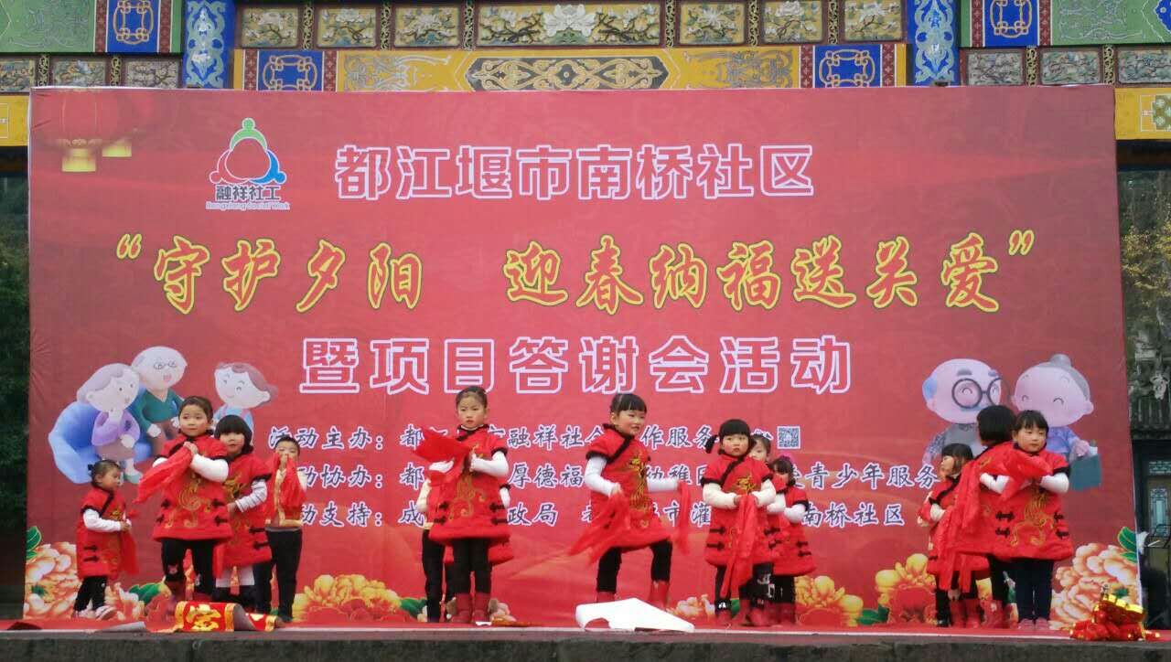 | 12月19日,本会都江堰华爱青少年服务中心与都江堰市融祥社会工作服务中心联合举行了“守护夕阳 迎春纳福送关爱”活动。来自厚德福美乐幼稚园、快乐老妈舞蹈队、俏夕阳舞蹈队所带来的16支精心编排的节目,汇演成一台精彩纷呈的视听盛宴。欣赏完精彩的节目之后,观众们还参与了社区精心组织的新春游园活动,赢取丰富的新年小礼品;6位活泼可爱的小朋友将自己亲手做的新年礼物送到了社区老人的手里,表达对长者的关爱和祝福;本会同工与南桥社区工作人员一同上门探望5位困难、空巢独居和高龄老人,为老人贴上喜庆的春联和窗花剪纸,并送上新春慰问物资,通过活动弘扬尊老敬老美德,倡导全社会一起用心关爱老人,用爱守护夕阳。 |