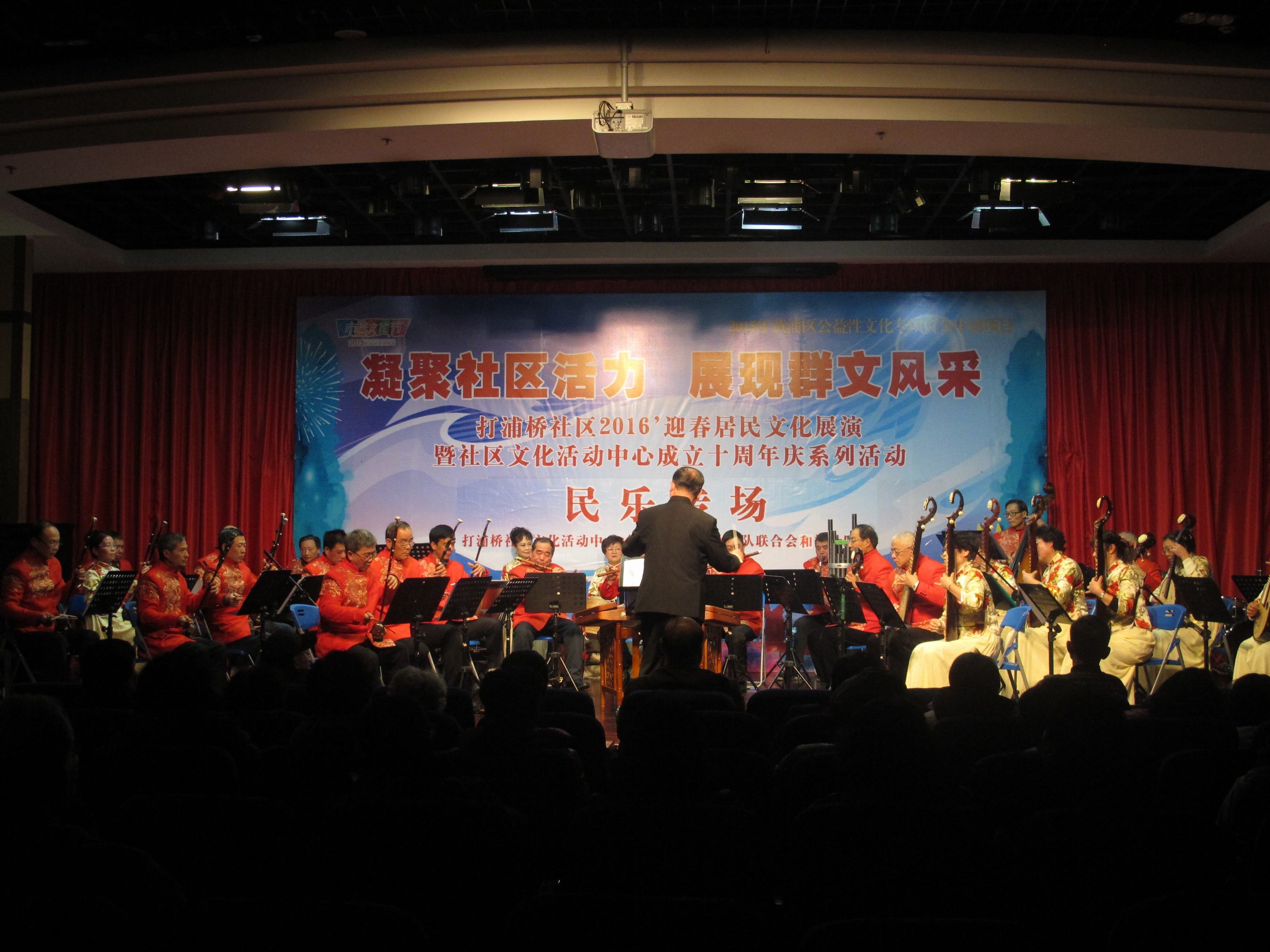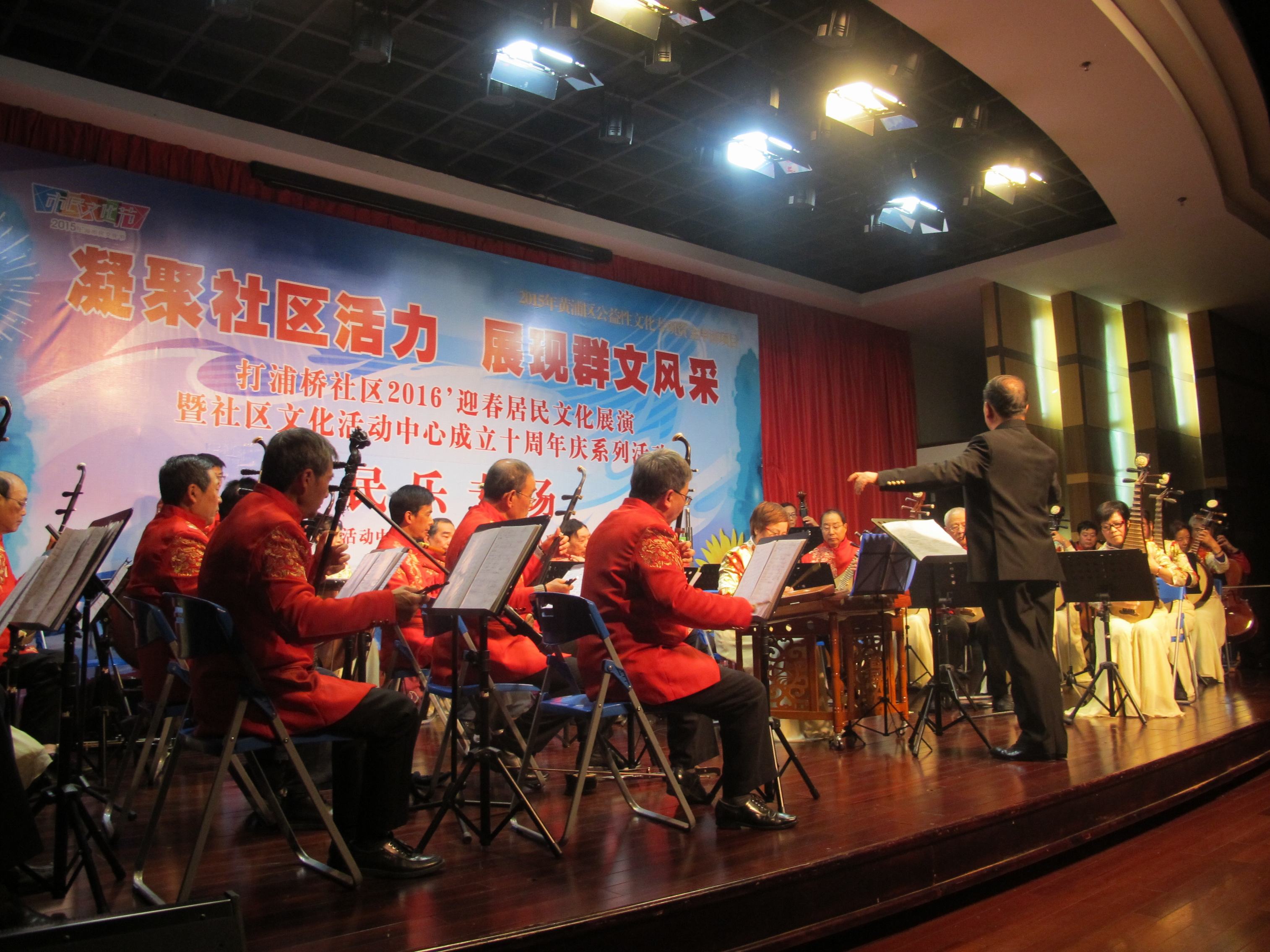 | 1月27日,本会受托管理的打浦桥社区文化活动中心的“凝聚社区活力,展现群文魅力”——打浦桥社区2016迎春居民文化展演暨中心十周年庆系列活动民乐专场演出隆重举行。来自中心的和韵民乐团向大家展示了建团十四年来的点点滴滴以及在打浦桥社区收获的喜人成绩,更现场为观众送上了创新编排的民乐交响变奏曲,他们坚守“为他人老有所乐、为自己老有所为”的信念,凭借中心搭建的舞台,用自己的一技之长发挥余热,为社区和谐氛围和精神文明建设贡献自己的才能。 |