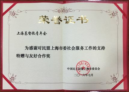 本会荣获中国民主同盟上海市委员会,为感谢上海基督教青年会对民盟上海市委社会服务工作的支持所特赠授予的友好合作奖。这是民盟上海市委对本会工作的认可和肯定,也鼓舞和激励本会继续继承和发扬盟的优良传统,实践“做实事,做好事”的精神,不断丰富中国特色社会主义学习实践的内容,为推进中国特色社会主义事业再立新功,在社会服务层面上更好地发扬宣传基督教青年会力量。