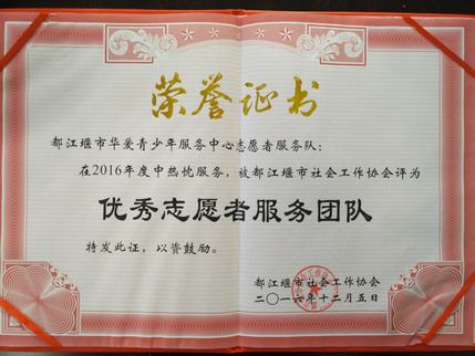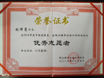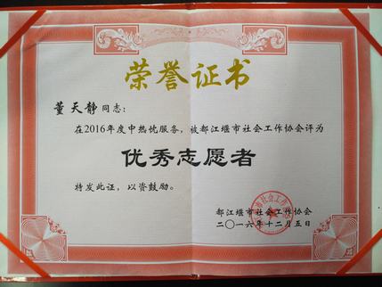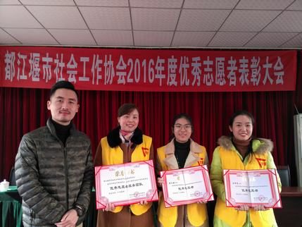 12月5日,正值国际志愿日,本会都江堰华爱青少年服务中心,荣获了都江堰市民政局与都江堰市社工协会颁发的“优秀志愿者团队”称号。中心志愿者董天静与刘译蔓同学获得“优秀志愿者个人”,表彰大会上,董天静同学作为优秀志愿者代表进行了分享发言。