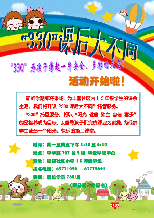 新的学期即将来临,为丰富社区内1-3年级学生的课余生活,本会华爱早教中心将开设“330课后大不同”托管服务。