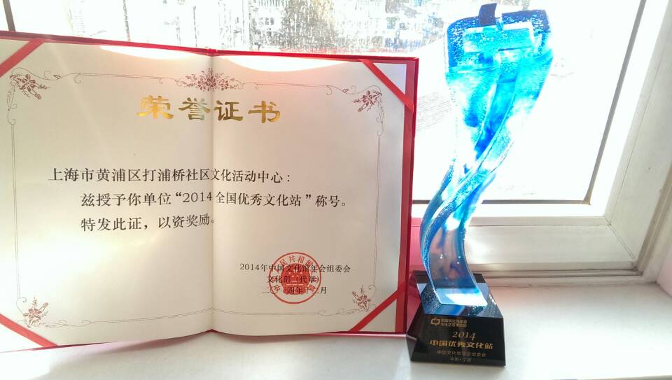 本会打浦桥社区文化活动中心经过一年的努力,围绕“倡导文化、学习文化、享受文化”的理念积极开展了相应的各项服务,于12月22日被中国文化馆年会组委会文化部授予了“2014全国优秀文化站”称号,以资鼓励。